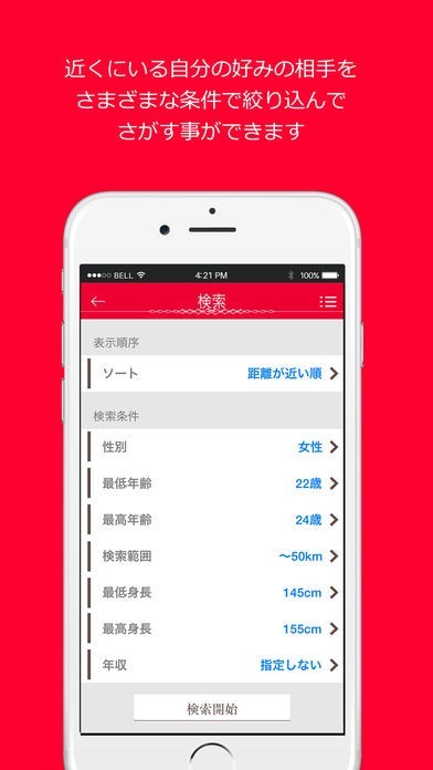 条件機能があり、性別や年齢、年収、身長など多くの条件を選択していく