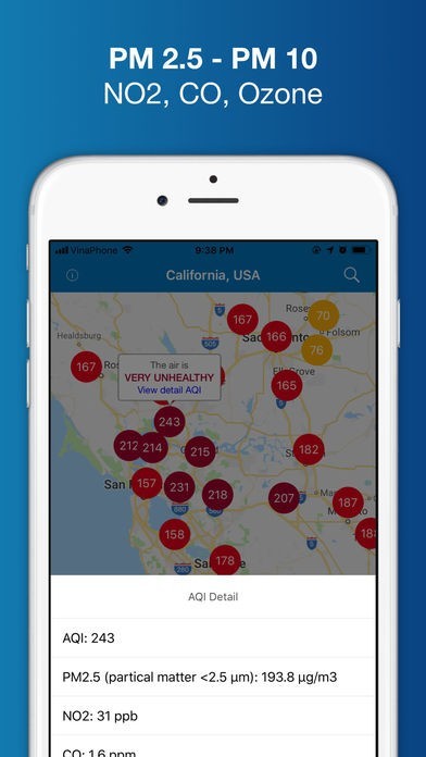 • Check detail AQI and information (PM2.5, PM10, NO2, CO, Ozone - O3),