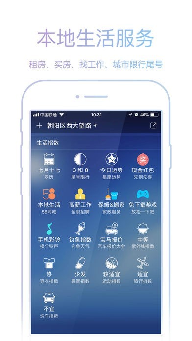 【更多功能】头条新闻资讯,娱乐八卦,体育赛事,日历,万年历,黄历,宜忌,风水,星座,运势,钓鱼,穿衣推荐,健康养生信息等贴心功能,一应俱全。