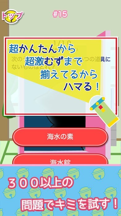 出題されるクイズは全部で300問以上です。難易度は易しいものから難しいものまで揃っており、マニアの方も楽しめる作りになっています。画面に表示される正しい答えをタップして解答してください。
