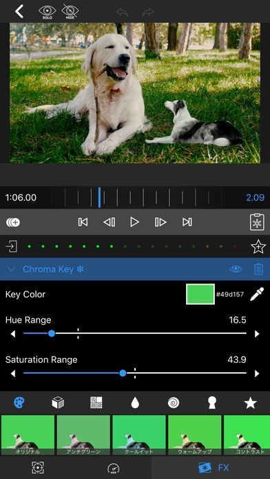 多彩なエフェクト機能を搭載していて、クロマキーを含めて数十種類のビデオエフェクトや、5ポイントレベルエディタなどの強力なカラー補正機能などを利用することができます。