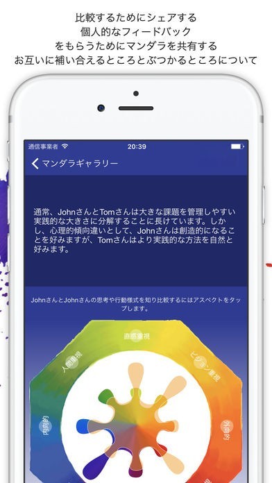 同僚、友人、家族とあなたのマンダラを共有することで、お互いに補い合えるところや衝突しやすい状況など、個別にカスタマイズされたのフィードバックを見ることができます。