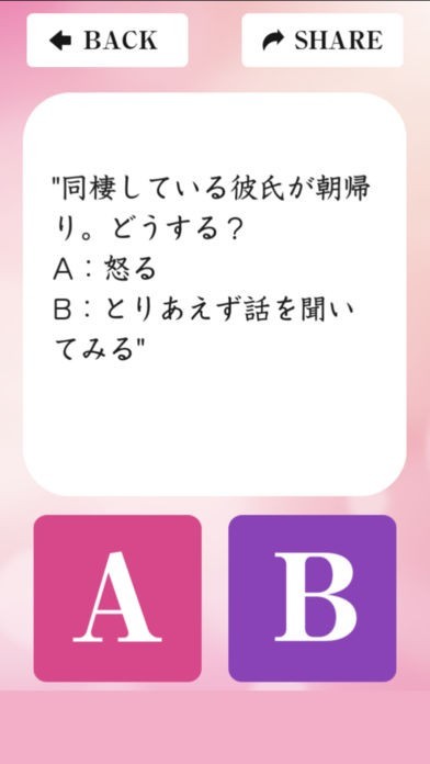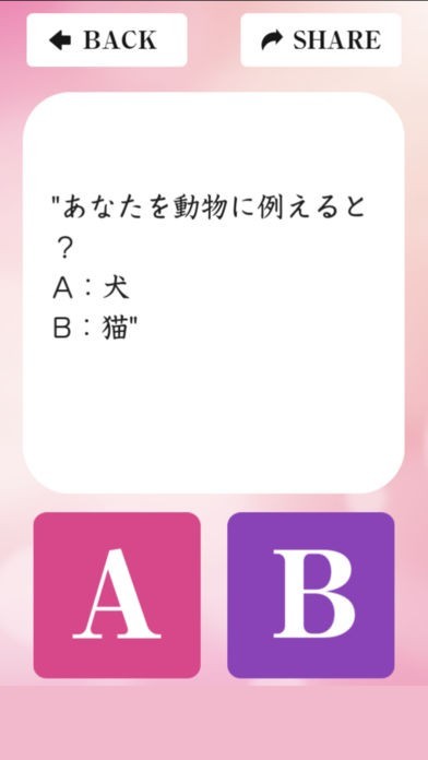 2択の設問が掲載されていて、タップ操作で素早く回答出来るようになっています。またバック機能が付与されているので、誤って回答してしまっても簡単に修正する事が可能です。