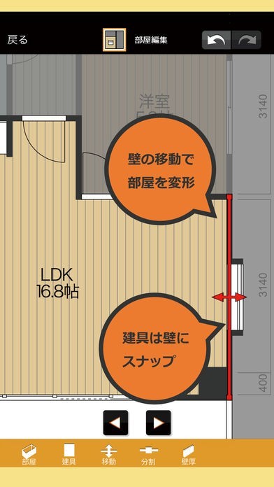 家具の配置を変えて気分転換を図りたいと思って勘に頼って動かしていくと家具の入るスペースが取れなかったりドアが開けにくい配置にしてしまったという事を無くせる図面作成のアプリです。