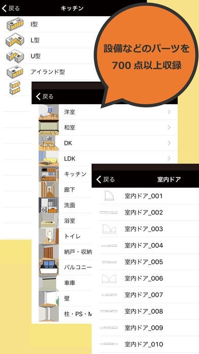 リビング、ダイニング、キッチン、洋室、お風呂場などそれぞれのお部屋で必要な設備・建具のパーツを700点以上収録しているので、忠実に間取り図を再現することができます。