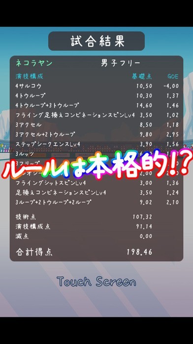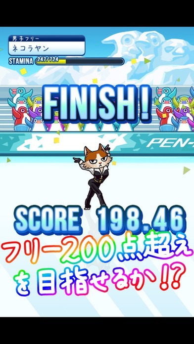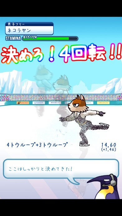 フィギュアスケートを楽しみたいけれど時期が合わなくて放送されていなくて楽しめないという方にオススメしたいのが『フィギュアスケートあにまるず!』は本番の大会では演技の構成や予想順位によって設定する仕様になっているので本格的なルールで楽しめる育成ゲームのアプリになっています。 育成ゲームですが難しい操作は必要無く練習中にアイコンをタップすることでプレイヤーの思った通りに早く育成することができ、試合の時も演技構成を予想順位や選手の成功率に合わせて設定してあとは演技を見守るだけですが選手たちの演技の画像を楽しむことができます。 演技で上位に入ると観客のペンギンから投げ込まれるイワシを集めてリンクなどの施設を入手する事で選手を強くしていきます。