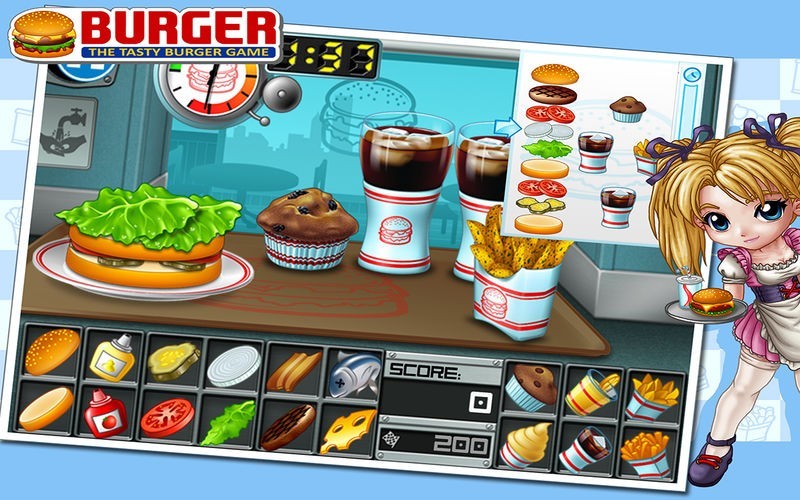 あなたがあるチェーンレストランに雇われて、お金とチップを稼ぐために、お客にできるだけ早く料理を出すのです。お客から注文を受けて、サンドイッチ、添え物、デザート、飲み物のレシピを作ります。プレーすればするほどもっと多くの材料がファーストフードのメニュに表示されます!
