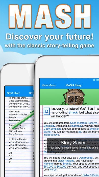 Play MASH (Mansion, Apartment, Shack, House) and find out where you'll go to college, what you'll do for a living, even how many kids you'll have, and much more. Play it with your friends!