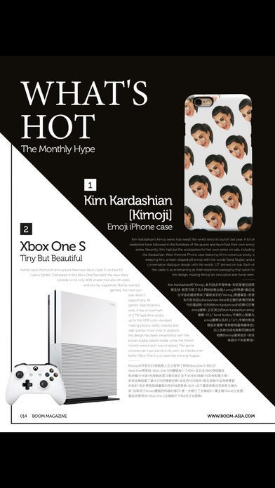 App Storeより引用BOOM connects trend-conscious readers with the latest in music, clubbing, fashion and art in Hong Kong, Macau and across Asia. Published monthly in English and Chinese, the magazine features interviews with leading performers, cutting-edge fashion editiorials and visuals by emerging and established artists.