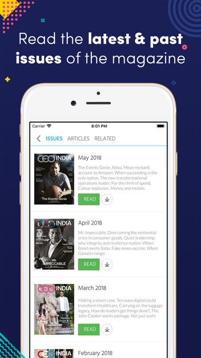 App Storeより引用CEO India is a monthly lifestyle magazine, capturing life, views and philosophies of the CEOs and top-level management professionals, who are some of the finest in our country. Besides in-depth interviews with the CEOs and senior professionals, CEO India has sections on health, an investment guide, technology trends and culture. CEO India has it all--business strategy, savoir-faire and glitter.