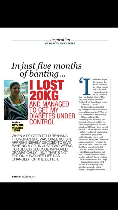 App Storeより引用LOSE IT! The Banting Way (volume two) is much more than a magazine – it’s the chance to GET YOUR LIFE BACK. Ask Billy Tosh, who lost an astounding 84kgs in seven months – or just read his story on page 6. LOSE IT! Volume Two answers all your questions, from why cream is better than milk in your coffee to how to combat your craving for sweet things. It has everything you need to know to follow the Banting lifestyle and lose weight, clear your head, increase your energy levels, sleep better – all the while eating delicious, satisfying foods that are easy to prepare (there are also 32 brand new Banting recipes).