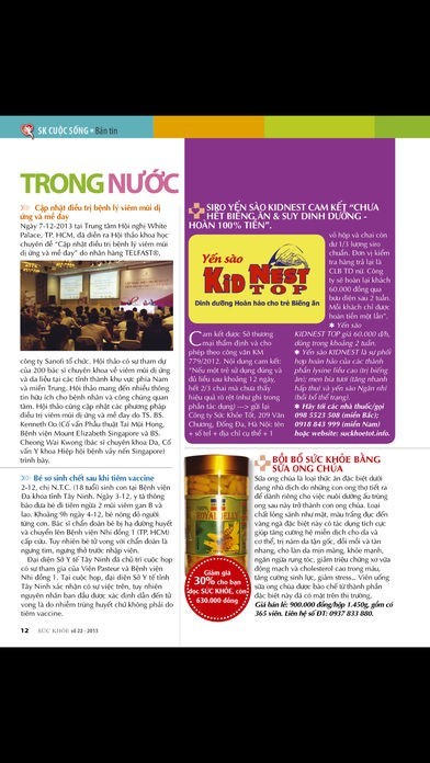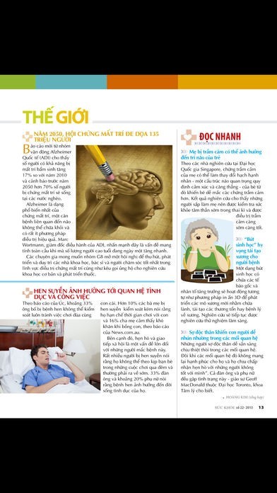 App Storeより引用Chuyên san phát hành định kỳ vào ngày 1 và 15 hằng tháng với những bài viết hữu ích, cập nhật về vấn đề chăm sóc và bảo vệ sức khỏe cho mọi lứa tuổi. Hầu hết các bài viết đều có sự tư vấn chuyên môn từ những bác sĩ chuyên khoa, đảm bảo tính chính xác, thời sự, giúp độc giả nâng cao kiến thức trong việc chăm sóc bản thân và gia đình.