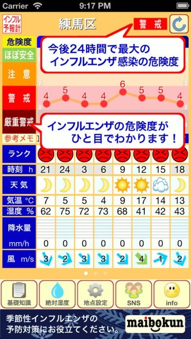 メリット:インフルエンザは感染力が強く発症すると自分だけでなく、家族や職場の同僚にも迷惑がかかります。このアプリを使用するとインフルエンザ感染の危険度がわかり、効果的な予防対策を行なうことが出来ます。