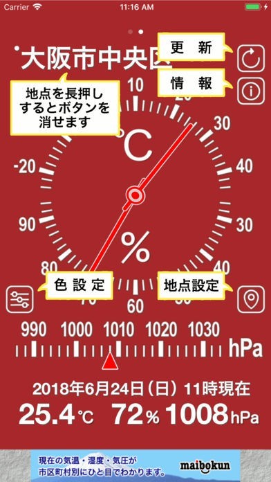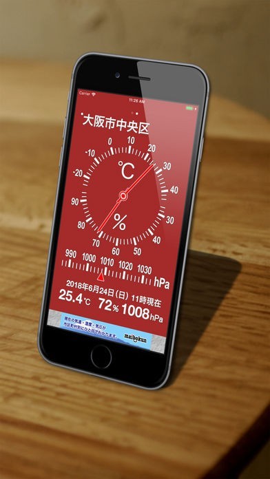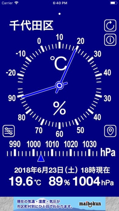 シンプルでアナログ表示された気温・湿度・気圧計です。5カ所まで地域を登録することができ、画面の色も変えることができるので登録ごとに色を変えれば見やすくなります。地点設定は自由に変えられるので、旅行先や出張先を一時的に登録することも可能です。5カ所の観測地点データを基に表示されるので正確で信憑性の高いデータが配信されます。他の地域の表示は左右へスワイプするだけなので、操作はいたって簡単です。誰でも使うことができます。
