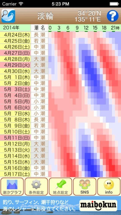 潮汐の確認は簡単です。赤色が濃いほど潮位が高く、青色が濃いほど潮位が低いことを表します。潮汐グラフで当日およびその前後の日の潮汐状況を、さらにわかりやすく確認することもできます。