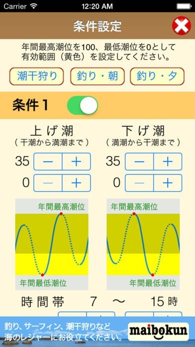 表示させたい地域を地点設定に登録できます。地点は最大5つまで登録可能。また条件設定では時間帯や潮の満ち引きの状況など、最大で3つまで条件を指定できます。上手く使えば最適な情報をゲットすることができるでしょう。