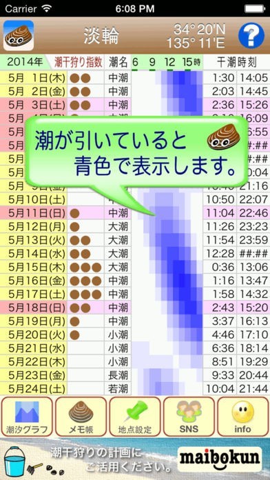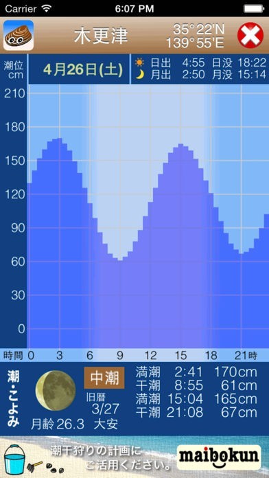 スマートフォンで24時間の潮汐情報をチェックすることができるアプリとなっているので、マリンスポーツや潮干狩りなどを行う際に役立つ情報を容易に取得することができます。