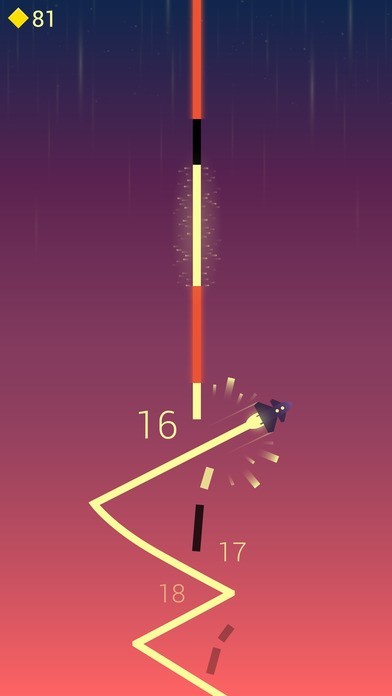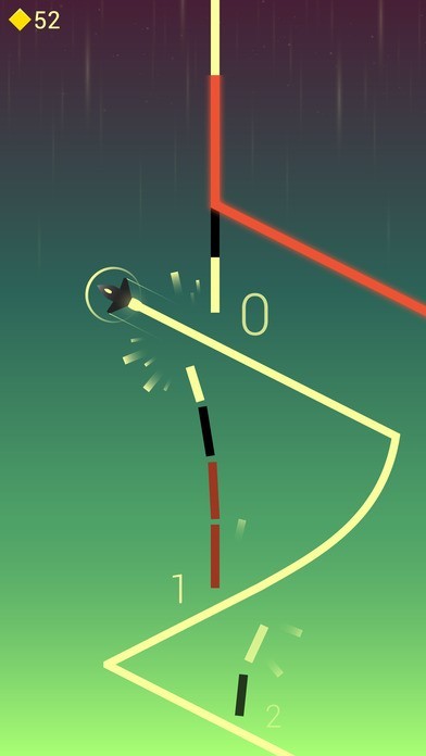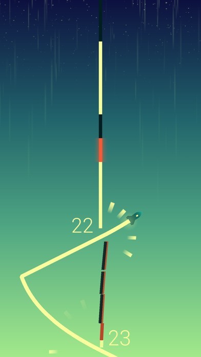 ロケットはタップして進路変更をしないと失速して行くため、背景に取り残されてゲームオーバーになってしまいます。画面の中央には色のついたラインがあり、ある程度の速度を保ちながら突破するチャンスを狙います。