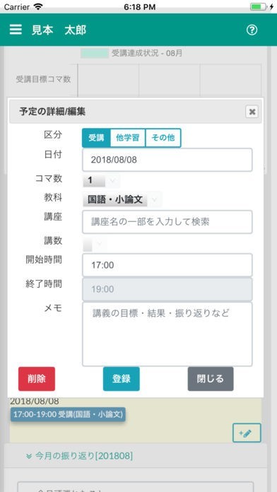 アプリに学習予定を登録すると、学習の進歩を確認することができます。進歩状況を知ることで自立学習がしやすいです。また、校舎からの連絡を受け取ることもできるので、急な休校も時間変更も管理しやすく便利です。