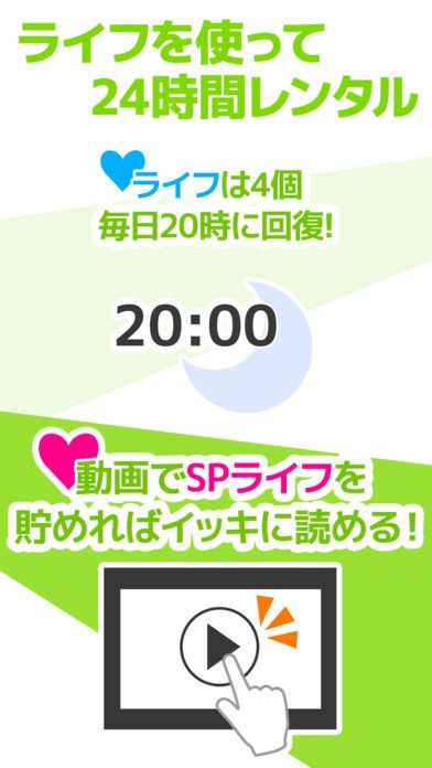 1日1回20時に4つずつ配布される「無料ライフ」を使用し、対象となる話を無料で24時間レンタルできます。
