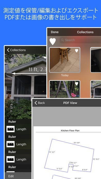 ものの長さや面積、体積を測ることができる測定アプリです。 AR(拡張現実感)を使って測定することができるため、メジャーを持ち歩いたり体積を計算したりといった必要がありません。 高さや長さはもちろん、長方形や円柱などの物体を簡単に測れるモードが搭載されているだけでなく、画面に映った測りたい物体を指でなぞることで測定できる曲線ツールなどによって様々なものを測ることができます。 測定したものはiPhoneやiPadに保存しておくことができるため、いちいち測り直さずともすぐに見直すことができるなど比較する際にも便利です。
