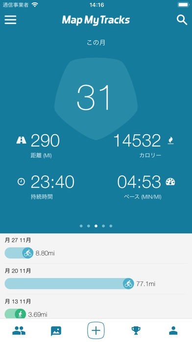 距離や時間などのデータを自動で集計してくれますので、ムダな作業が発生しない点もポイントです。ウォーキングアプリのようにその日または月で見ることができ、多すぎず少なすぎずといった運動量の調整にも活用できます。