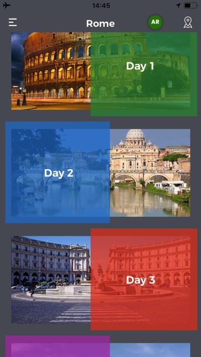 拡張現実。他の旅行ガイドとは違いこのアプリには、街を散策するのに便利なiPhone とiPadのツール(AR)が搭載されています。ARボタンをクリックし、360度回転すると、お勧めの観光スポットと行き方を表示してくれます。上下に画面をスクロールすることで、近くの観光スポットだけでなく、遠くの観光スポットも見ることが出来ます。