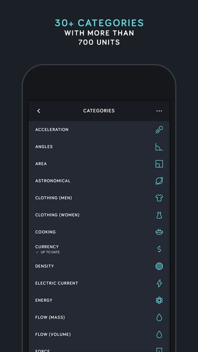 Categories Amount Plus can handle: Acceleration, Angles, Area, Astronomical, Clothing (men and women), Cooking, Currency, Data, Density, Electric current, Energy, Flow (mass and volume), Force, Frequency, Fuel Consumption, Illuminance, Length and Distance, Luminance, Metric System, Network speed, Power, Pressure, Radiation, Sound, Speed, Temperature, Textile Yarn, Time, Torque, Transportation Cost, Typography, Viscosity (dynamic and kinematic), Volume, Weight and Mass.