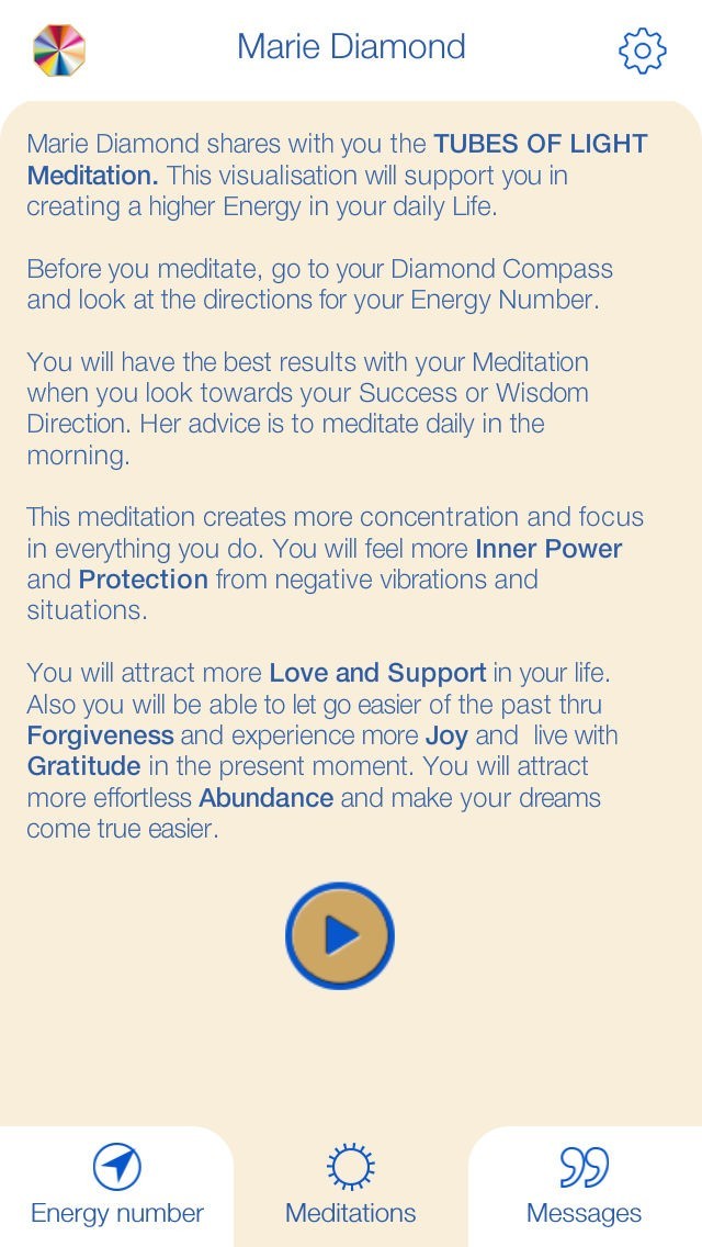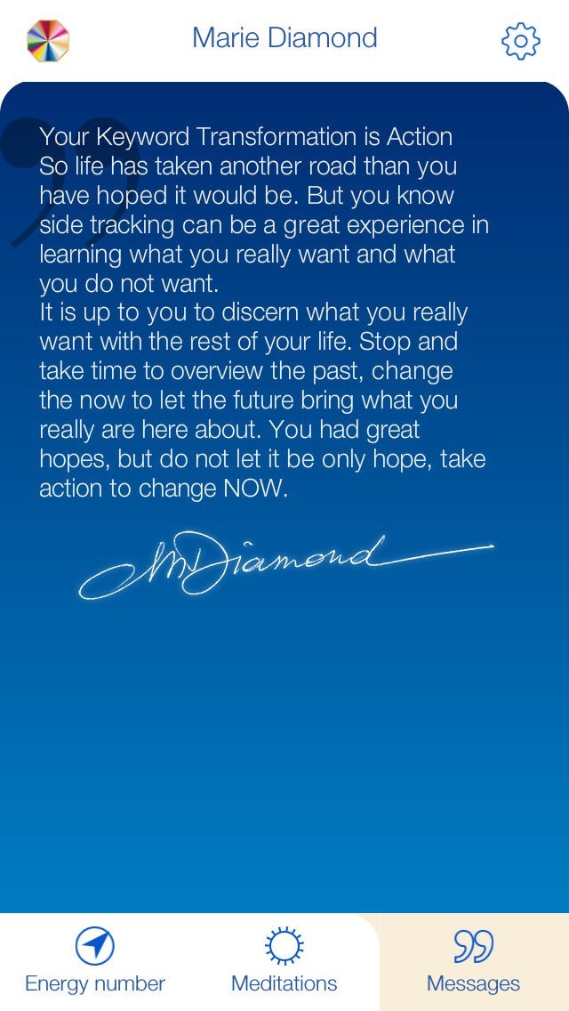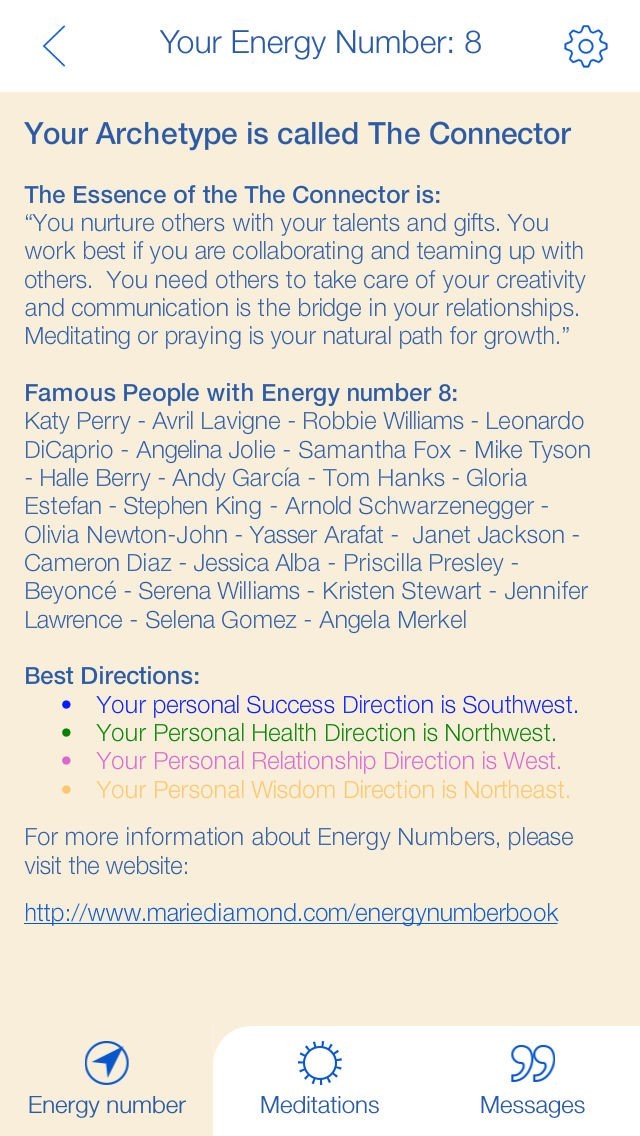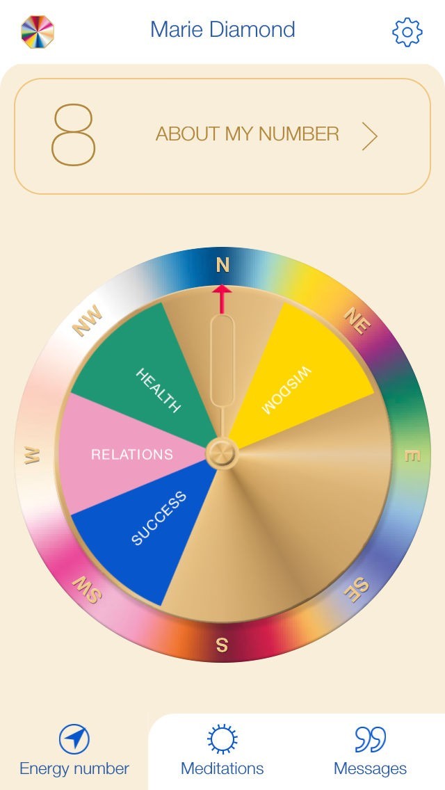 Transform the energy of your environment through your Energy number. Your Energy number indicates your Energy Archetype and gives your four best compass directions that support your Success, Health, Relationships and Wisdom. The Marie Diamond compass in the App shows immediately where these directions are located in the room that you are using the Marie Diamond App. When you know your directions you can activate them with the right Diamond Feng Shui tips.