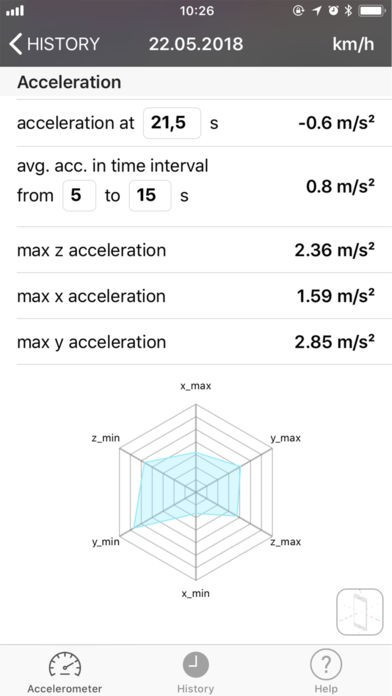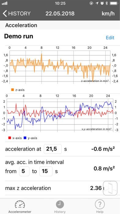 App Storeより引用Accelerometer collects data from your phone’s accelerometer and uses your location services to track your instantaneous velocity. It visualizes the data in three simple real time charts.
