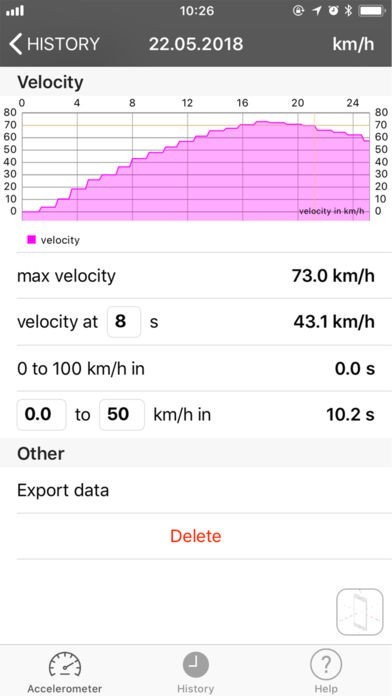 - interact with the collected data (e.g. get instantaneous acceleration at desired point in time or calculate time taken to reach certain velocity)