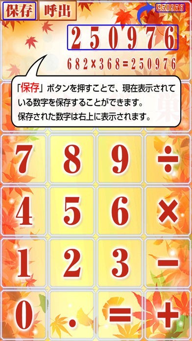 App Storeより引用秋の季節に輝く紅葉が美しい、和風で綺麗な電卓です。