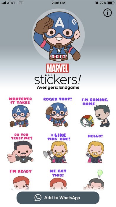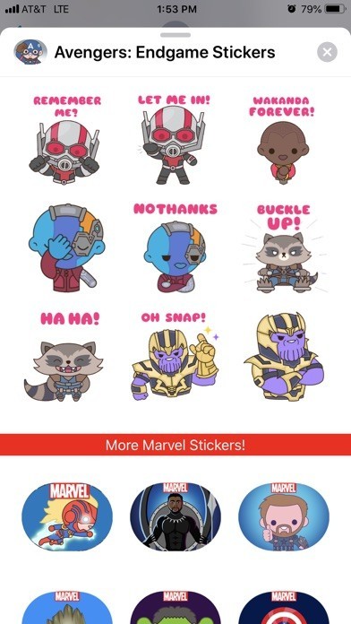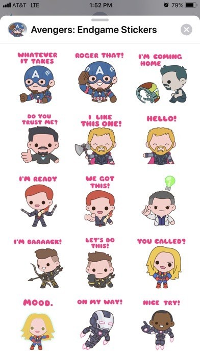 App Storeより引用We’re in the Endgame now! Download this new pack of 24 Marvel Studios’ Avengers: Endgame animated stickers including Iron Man, Captain America, Thor, Black Widow, Hulk, Hawkeye, Captain Marvel, Ant-Man, Okoye, War Machine, Nebula, Rocket, and Thanos!