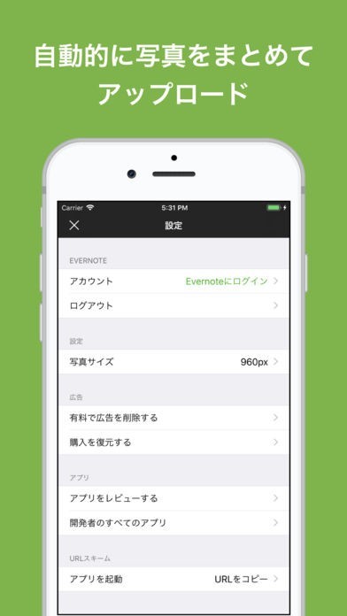 このアプリはEvernoteAPIを利用しています。一定時間内に写真をアップロードし続けるとAPI制限にかかる場合がございます。