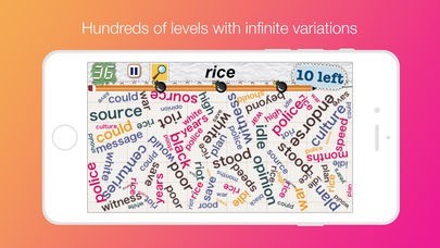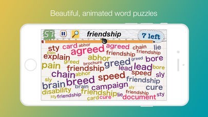 色のついた大きさや向きがバラバラになった単語が画面いっぱいに敷き詰められています。その中から特定の単語を素早く見つけ出す言葉遊びゲーム。子どもから大人まで安心して遊ぶことができて、自然と語彙が深まります。