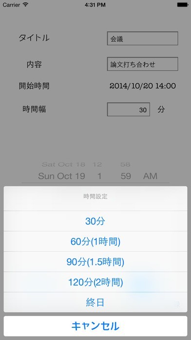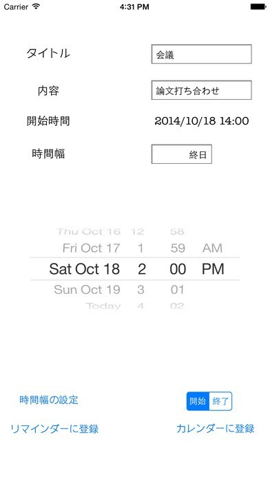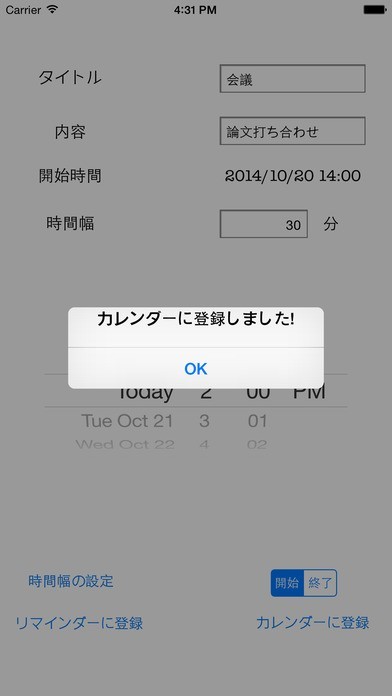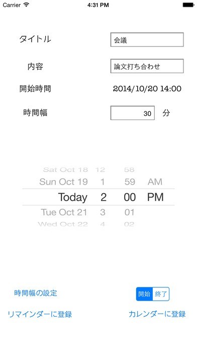 タイトル・内容・開始時間・時間幅を設定するだけで、iPhoneに搭載されている標準カレンダーにすぐに同期されるので、簡単にスケジュールを入力することができます。タイトル・内容のどちらかは省略可能で、時間幅の設定も用意されている時間から選ぶだけなので項目が少なく入力するのに時間がかかりません。リマインダーにも登録しておけば大事なミーティングなどに遅刻する心配もないので、ビジネスシーンのスケジュール管理に重宝します。アプリの起動画面の操作だけで全て終わらすことができます。カレンダーに一つ一つ予定を入力する手間が省けるので時間のない方にピッタリです。
