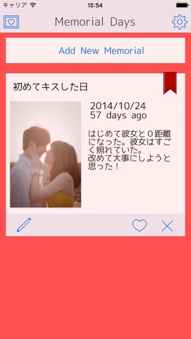 カップル専用アプリ『MemorialDays』では、カップルのための多彩な機能で、2人の思い出をしっかりと残すことができます。 初めてのデートや初めてキスをした日など、カップルだけの特別な記念日を設定可能。 彼氏彼女と一緒に使用することで、付き合い始めてから何日が経過したのかを教えてくれるシステムなども充実しています。 パスワード機能でプライバシーを守れる他、背景色のカスタマイズなども可能。 恋人と一緒にラブラブな思い出を残してみてはいかがでしょうか。