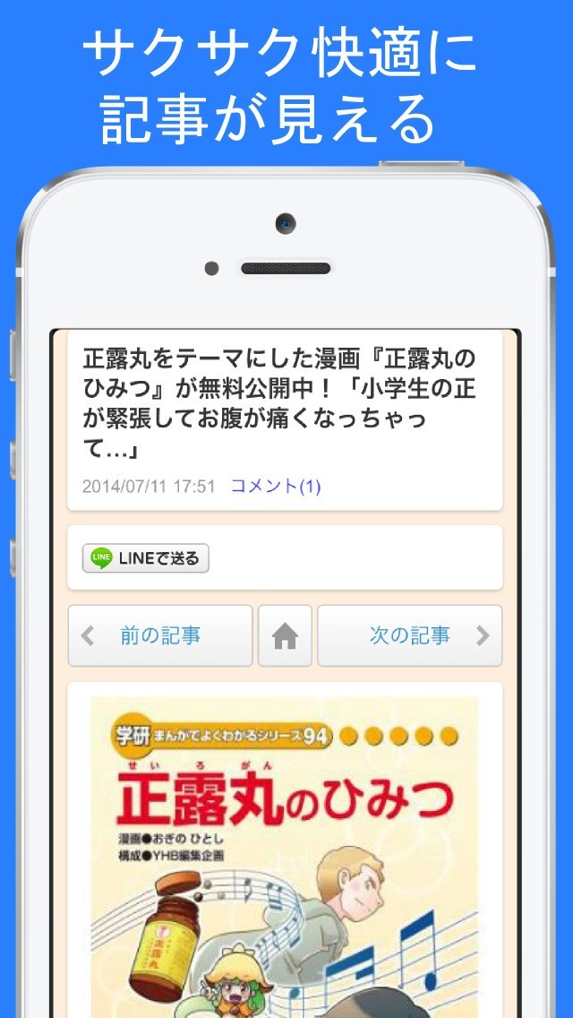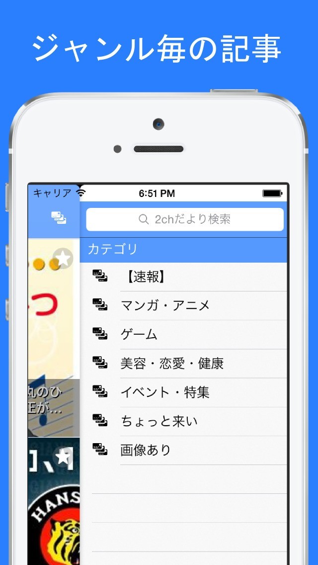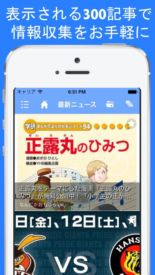アニメ、マンガ、ゲーム、健康、美容などの2chまとめ記事が7つのカテゴリに表示され、300件の記事の中から好きな記事を読めるニュースアプリです。ブログ別ニュースでは、好みのサイトを設定することで見たいサイトの記事だけを見ることができます。記事の画像を友だちとシェアしたり、よく見られている記事を探したり、お気に入りの画像をカメラロールに保存することもできます。「あの記事が見たい」という過去の記事も単語で検索して探せるのも便利です。