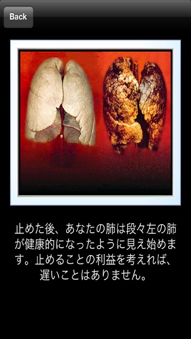 あなたの喫煙習慣と詳細情報を入力し、禁煙によって寿命の延びや、血液循環、肺機能、貯蓄額などの改善が期待されることを様々な指標が示すのを見るだけです。10種類を超える読み出しで、得られる情報量は十分。モチベーションも上がります。iOS用My Last Cigaretteが、この命に関わる中毒に再びはまらないための助けとなることは実証されています。タバコの悪影響についての長年の医学研究の成果を活用した本格的なツールです。舞台裏で起きている健康状態の改善が可視化されることで、あなたの意思も強まり、決心も確固たるものとなるはずです。ユーザーからの感謝コメントをぜひ、読んでみてください。