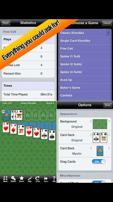 ソリティアの統計を出せるので、繰り返しプレイしていくと強くなっていくのがわかって夢中になります。