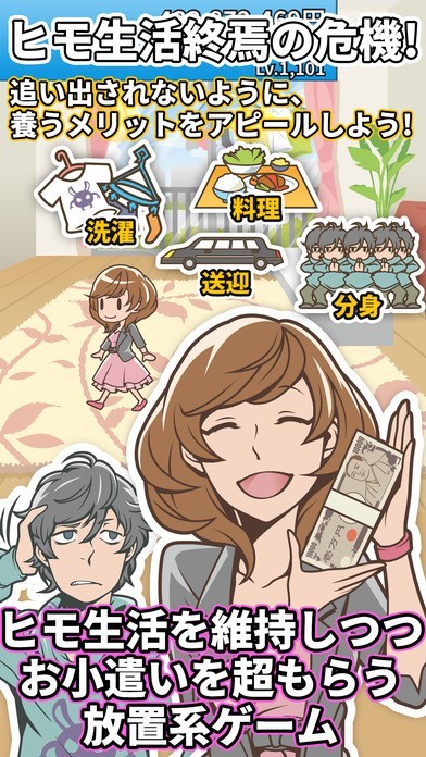 「超ヒモ理論 ~働きたくないでござる~」は働きたくない男となって、彼女から追い出されてしまわないようにうまく立ち回るゲームです。ルールはシンプルで、料理や洗濯などの家事を行ったり、彼女の職場までの送り迎えをすることによって自分と生活をするメリットを感じてもらいましょう。うまくいけば彼女はお小遣いを渡してくれます。お小遣いの量は前回の起動時間からの経過によって増加します。例えば、1時間前にプレイした場合と一日前にプレイした場合とでは後者のほうがもらえるお小遣いは多くなります。じっくりと腰を据えてプレイするよりも、間をあけてのんびり楽しめるゲームです。