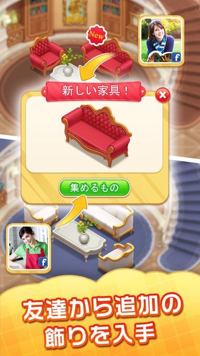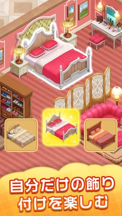 マッチングトン·マンションではパズルゲームを進めるごとに自分の部屋に新たな家具や飾りなどが配置できるようになっており、自分好みの部屋へと作り変えていく過程が楽しめます。