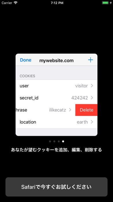 ブラウザが持つクッキーデータをSafariを使用して追加、編集、削除することができます。なので、Webアプリの動作確認時に、さまざまなデータを入れてみて正常に動くパターンを確認するなど開発効率を向上させる目的で使用することができます。
