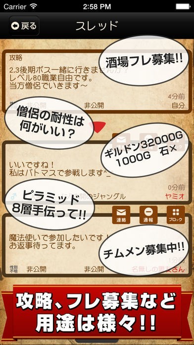 などなど、攻略についての相談、バザー販売やイベントの告知、フレンドやチームメンバー募集をしたり様々な用途で活用できます。