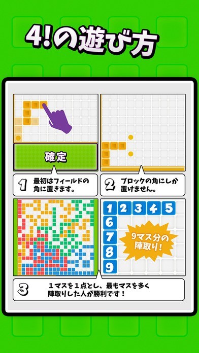 パズルゲームだけでなく、自分の陣地を広げていくというシミュレーションゲームの要素も持っているおすすめのゲームアプリが「4!」です!毎ターン追加されていくブロックを平面のフィールドに置いていくことで、自らの陣地を形成していき広い陣地を手に入れたほうが勝ちというシステムになっていて、十分に考えながらプレイする必要があるので脳のトレーニングをするのにもおすすめです!全部で50の印象的なステージが用意されているので、さまざまなシチュエーションを楽しめるのが魅力!