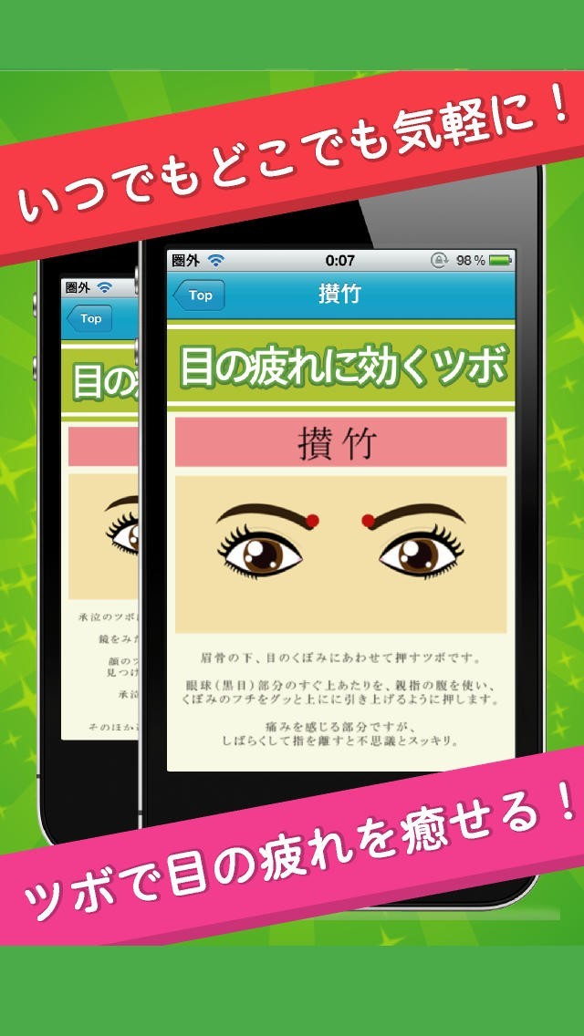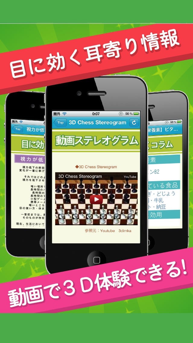 「超3D視力回復!」は1日5分で視力を回復できるアプリです。目に良いとされる立体視で見るステレオグラムが多数、静止画の他に動画も用意しています。ステレオグラム初心者にも安心の見方付き。ピントをあわせるだけで、簡単に目のトレーニングができます。さらに、目に良いツボをイラストで表示。場所がひと目でわかりますし、それぞれのツボの効果についても説明も記載しています。目に良い栄養素についてのコラムもあり、入っている食材も紹介しています。