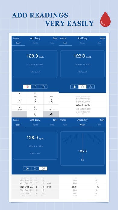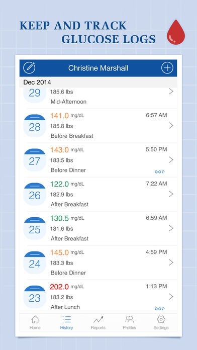 毎日の血糖値や体重を記録し、糖尿病を予防したり症状を改善したりして健康な体を手に入れます。午前と午後の測定値の統計はもちろん、週や月ごとの統計に関する情報を見ることができます。