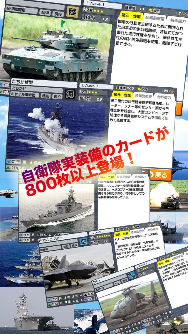 「ふるさと自衛隊」は、装備カードを集めて部隊を強化していくゲームです。
