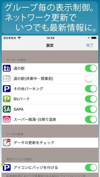 施設データは最新の状態が維持できますので、行ってみたら閉まっていた、内容が全然違ったなんてトラブルの心配は必要ありません。道の駅や入浴施設などのグループ分けが分かりやすさを格段に向上させており、さらに表示設定で必要のないグループは隠すことも可能です。
