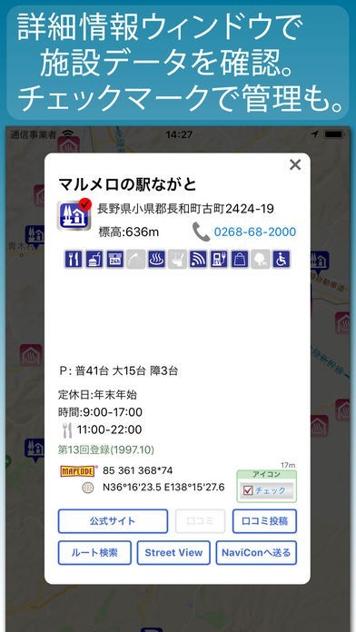 施設にチェックマークが付くのでドライブコースの計画時に活用してみよう